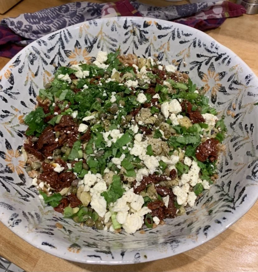 Farro, Roasted peppers, artichokes, capers, black olives, feta, chick peas, fresh oregano, fresh basil, salt, pepper, olive oil and vinegar. Mix together and ENJOY!